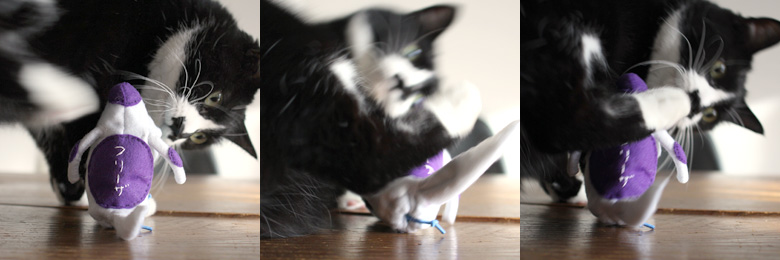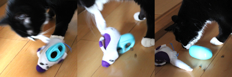 ネズミのカバーだと、上手にハンティングできなかったゴローですが、自作のフリー○様カバーだと、とっても上手にハンティングすることができました。