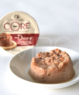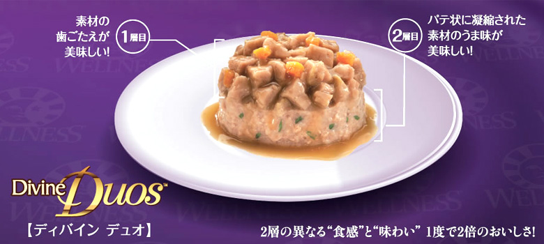 厳選素材を使用したウェルネス ディバインデュオシリーズは、「パテ状の層」「角切りのお肉が入ったシチュー層」の2層タイプの、ウェットフード。