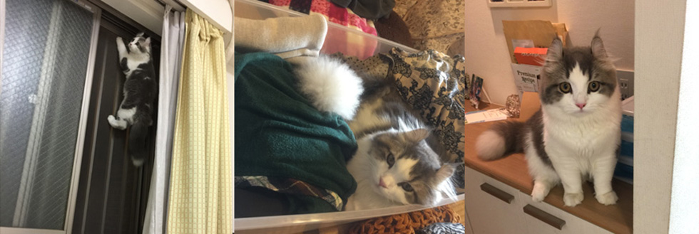 エリザベスは保護してからしばらくは脱走しようとして肝を冷やしたのですが、オスカーは脱走する気も見せなくて安心しています。カーテンに登ったりシンクで遊んだりしなくなるともっと安心なんだけどな?。"