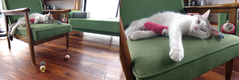クローゼットの奥にしまった袋から、おもちゃ(毛糸の手作り)を取り出してひとり遊び!あちこちにおもちゃを散乱させています。おもちゃを仕舞う場所をかえてもどうしてか見つかってしまうという、おもちゃ探しの名人です。満足気な顔にいつもまた見つかったか!と笑ってしまいます。