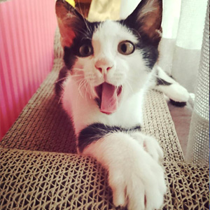 食欲旺盛で、台所に立つとすぐにやってきてスリスリ。キットキャットやアルモネイチャーのウェットフードが大好きで、開けると待ち切れずにすぐに、頭を突っ込んで食べ始めちゃいます!