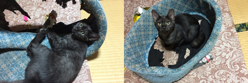 初めて向かえる夏用にとベットを購入しましたが、底が気になるらしくて毎日カリカリ…更に興奮してガシガシするので底布が破れてボロボロに。ガシガシする姿は可愛らしかったので、かわいい…かわいいイタズラって事にします。ベットもこのワンシーズンありがとう…よくぞ持ちこたえ?ました。