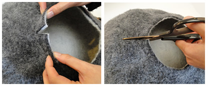 * 猫ちゃんの体の大きさに比べ、キャットベッドの入り口が小さい場合は入り口をカットしていただくことが可能でございます。キャットベッド本体は丈夫なウール素材でございますので、布のようにほつれる心配はございません。切りたての断面は軽く揉むと馴染みます。裁断の際は、裁断用の裁ち切りばさみをご利用下さい。(切り込みを入れる、もしくは丸くカットするのがおすすめです)