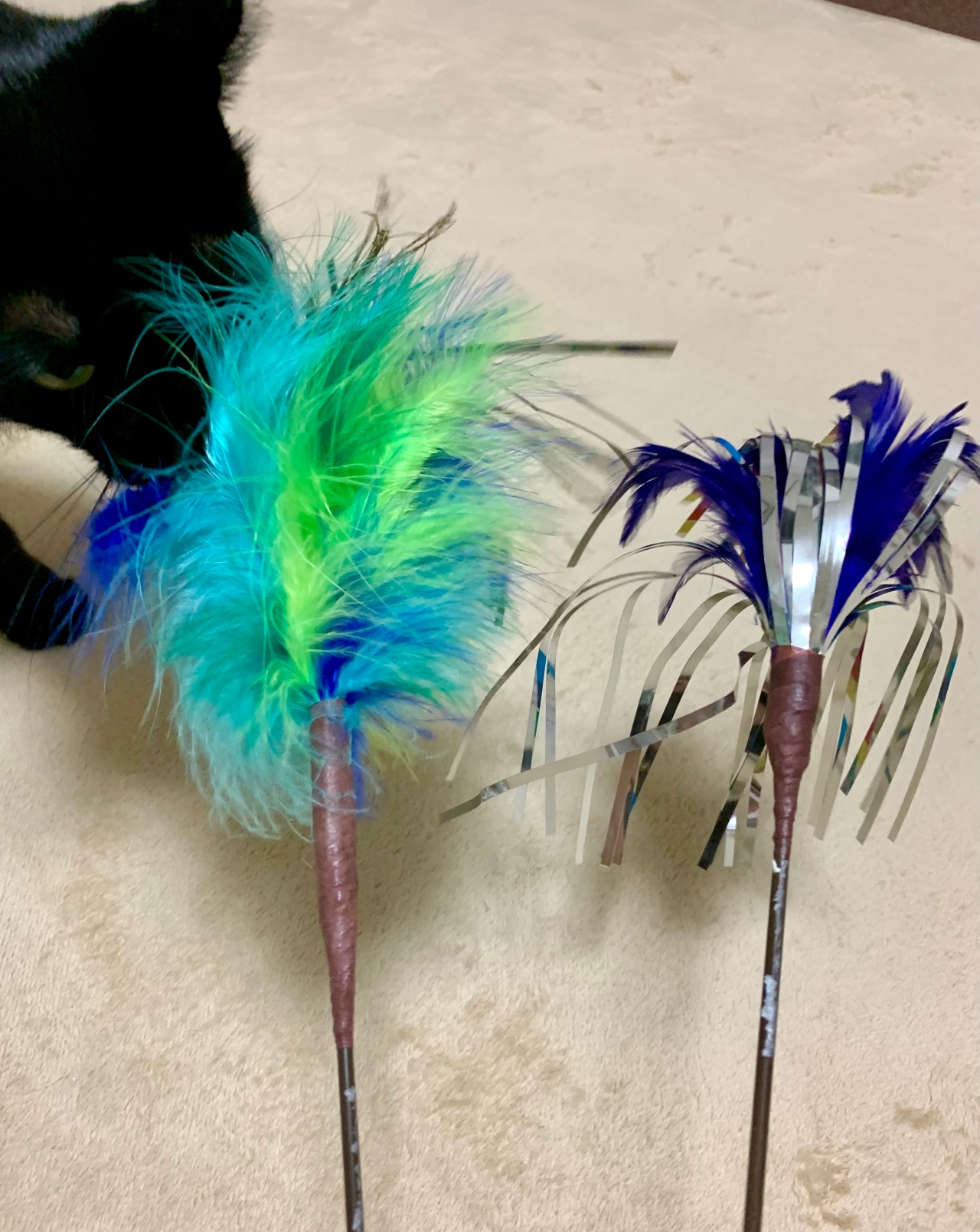 猫大興奮!キラキラ、カサカサくじゃくの羽の猫じゃらし。