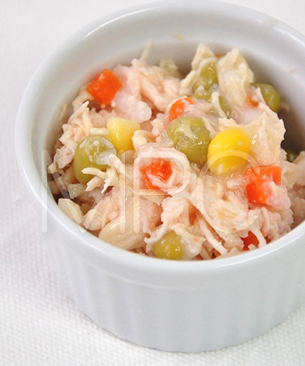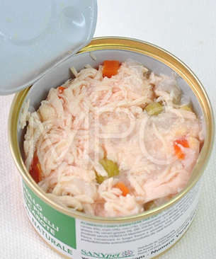 鶏肉をメインに、彩り野菜を添えた素材の形を残したフレークタイプのウェットフード。スープ多めに仕上げているので、猫の水分補給にも最適。ドライフードに加えて与えてください。使いきりサイズが嬉しい少量缶です。