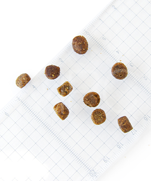 タンパク質 32%以上、脂質 17%以上、粗繊維 2.8%以下、灰分 8.2%以下、水分 9%以下