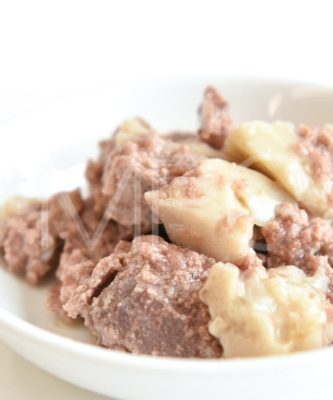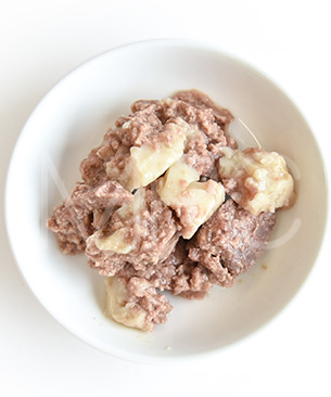 お肉のパテとミルク素材のゼリーが入った2重構造のウェットフード。・穀類不使用・大豆不使用・人工着色料不使用・人工保存料不使用●原材料名肉類(ポーク、チキン、ターキー、ビーフ)、乳製品(ヨーグルトパウダー)、ミネラル類 ●保証分析値タンパク質 9%以上、脂質 5.1%以上、粗繊維 0.3%以下、灰分 1.5%以下、水分 81%以下、タウリン 0.6g/kg○代謝カロリー 90kcal/100g AAFCO推奨係数での計算代謝カロリー 85kcal/100g●原産国名:ドイツ