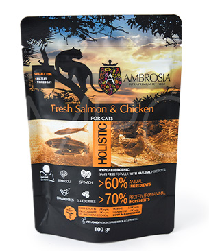 「アンブロシア CAT クラシック サーモン&チキン」は、タンパク質の70%が動物性タンパク質。シリーズの中で最もカロリーが高いので、活動的な猫にもおすすめ。粒形状は丸タイプの小粒です。