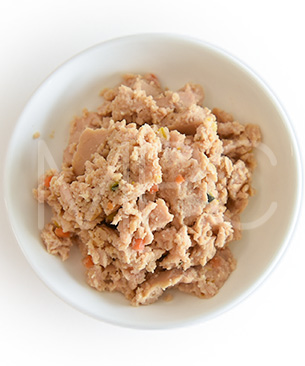 チキン、チキンレバー、タピオカスターチ、ニンジン、カボチャ、トマト、エンドウ豆繊維、ガラクトオリゴ糖、卵白、乳酸カルシウム、ヒマワリ油、ビール酵母、レシチン、クリルオイル、増粘剤(グアガム、カラギーナン)、リン酸ナトリウム、硫酸マグネシウム、塩化カリウム、ケルプ、タウリン、グルコン酸亜鉛、クエン酸鉄、キレートセレン、キレートマンガン、ビタミンE、グルコン酸銅、チアミン、リボフラビン、ビタミンD3