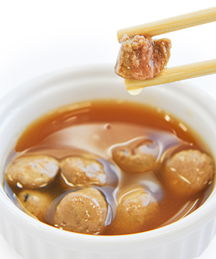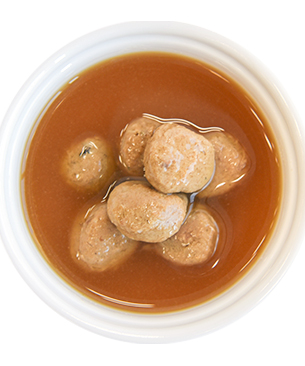 EPA、DHAが豊富なイワシを使用したミートボールを、猫や小型犬でも食べやすいサイズに仕上げました。スープにもイワシのうまみがたっぷりと溶けてます。