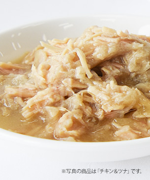 ツナ、大豆油、カシアガム、グァーガム、リン酸二カルシウム、ビタミン類(ビタミンA、ビタミンD3、ビタミンE、チアミン、リボフラビン、パントテン酸、ナイアシン、ピリドキシン、葉酸、ビオチン、ビタミンB12、コリン)、ミネラル類(カルシウム、リン、カリウム、ナトリウム、塩素、マグネシウム、鉄、銅、マンガン、亜鉛、ヨウ素、セレン)、ツナ抽出物、塩化カリウム、タウリン、塩化コリン、硫酸マグネシウム、フラクトオリゴ糖