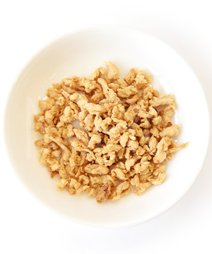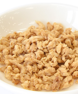 大豆の肉は、動物性の肉に比べて低脂質でコレステロールフリー。高タンパクで食物繊維も豊富なので、ヘルシーなオヤツとしてはもちろん、ご飯のかさ増しにも活用できます。グルテンフリー。