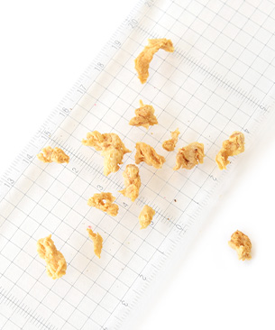 フリーズドライは素材をマイナス20℃以下に凍結させて真空処理を行い、水分を除去する乾燥方法です。栄養価・味などの損失が少ない加工方法です。