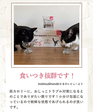 ガツガツ食べてくれます。便の調子も、今までは便秘だったり後半軟便だったりと不安定でしたがボナペティは安定した綺麗な便が出てました。また、いずれお世話になると思います。
