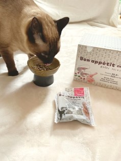 いつもは、カリカリならご飯は、チュールなどをかけないとほとんど食べないのですが、今回、何もかけずに美味しそうに、嬉しそうに食べています。個包装なので、管理しやすく、人にお試しであげたりもしやすいのではとおもいました。