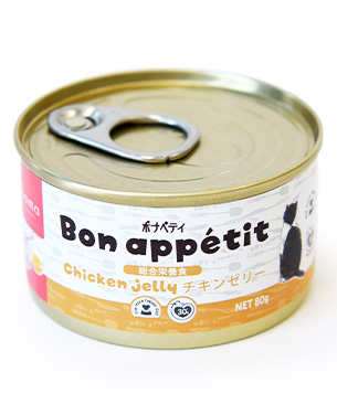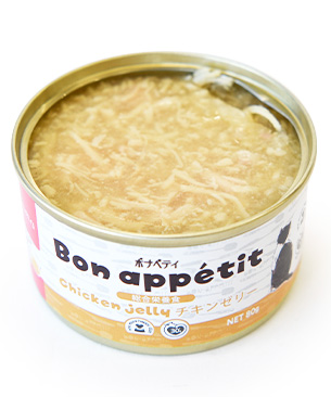 チキン、ヒマワリ油、チキンオイル、フラクトオリゴ糖、タウリン、増粘多糖類(カラギーナン、ローカストビーンガム、キサンタンガム、グァーガム)、ミネラル類(Ca、P、 Fe、 Cu、 Mn、 Zn、)、ビタミン類(A、 E、K3、 B1、 B2、パントテン酸、ナイアシン、B6、葉酸、B12、ビオチン、コリン)