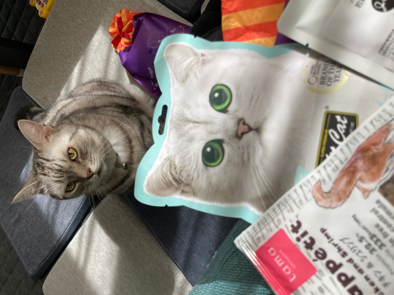 お買い得だったので2つ購入しました。他の種類も試したかったけど気づいた時には売り切れでした。ドライフードも食べたことあるので我が家の猫様にハロウィンプレゼントを準備してみました。開封したら早速寄ってきたので写真を撮ってみました。興味津々です。どれも完食するはずです。アメショの8歳雄猫です。名前はアーサーくんです。
