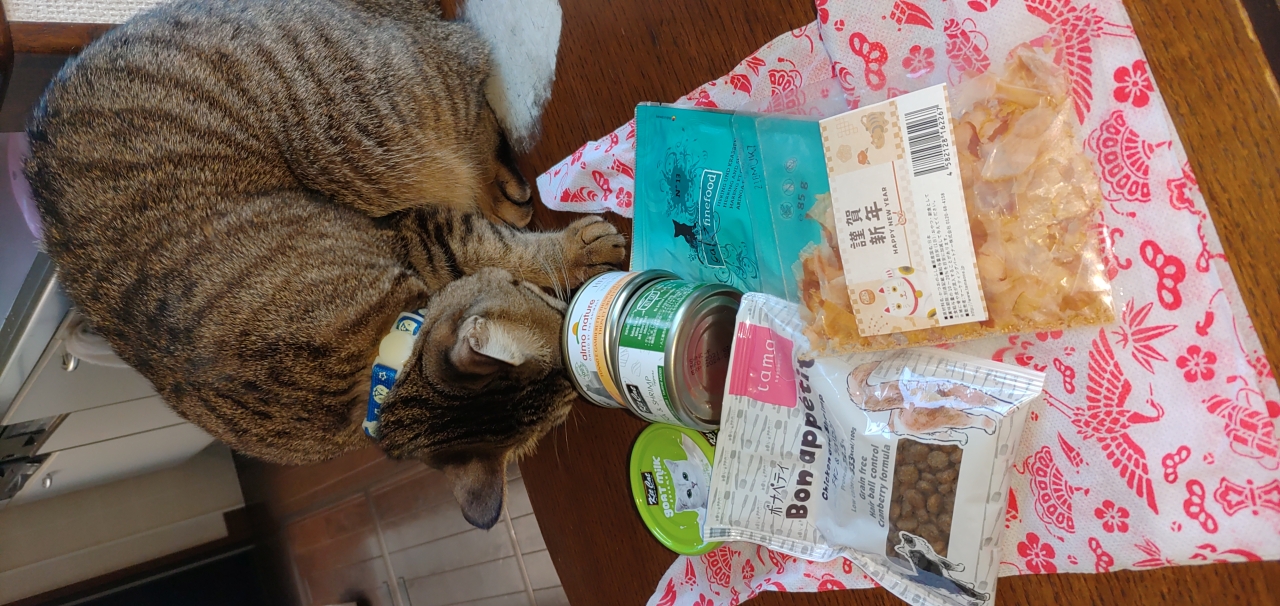 雑ですが我が家のにゃんこは大喜びしております。毎年これで年越し、年始のご飯になっています。写真にはキジ猫しか写っていませんが三毛猫もいます。代わりばんこで今年の福箱を確認中です。(^^)