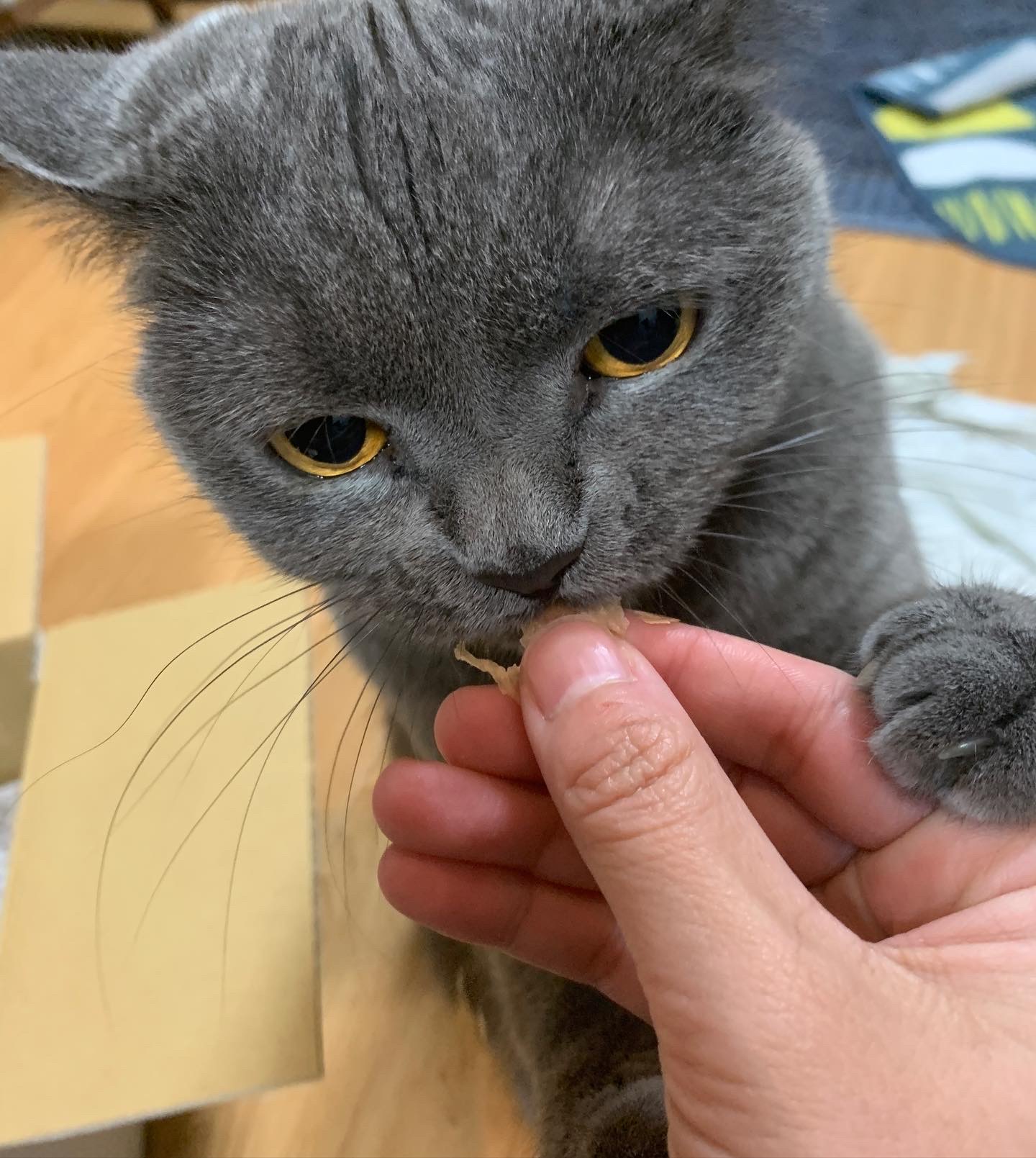 ジェニはルーミートが食べたすぎて、お手だけでなく、投げたおやつをキャッチする技を覚えました。猫友達にも好評なので、絶対に販売を継続して欲しい一品です!